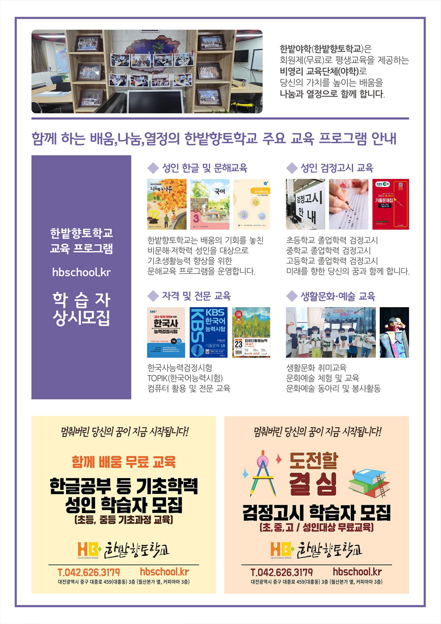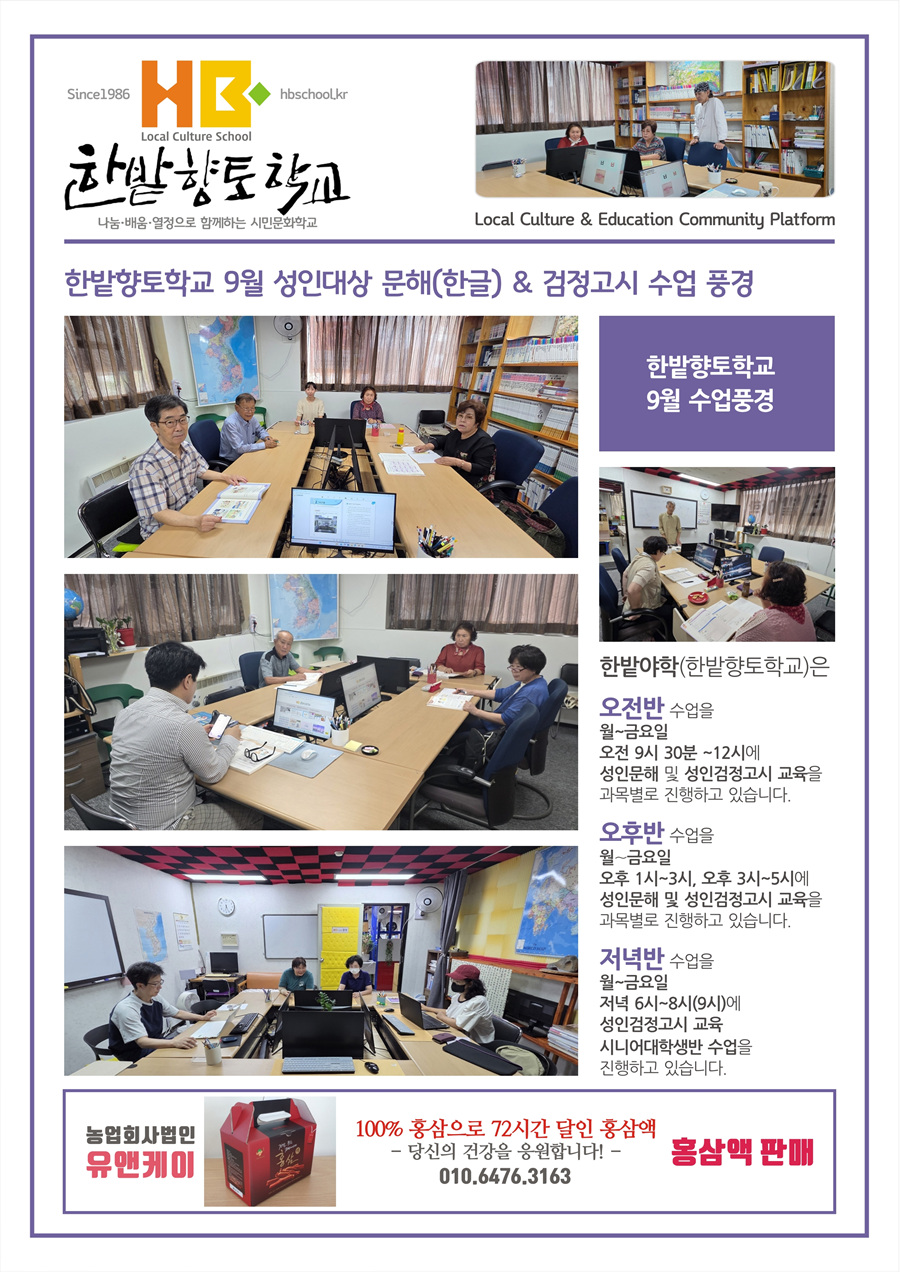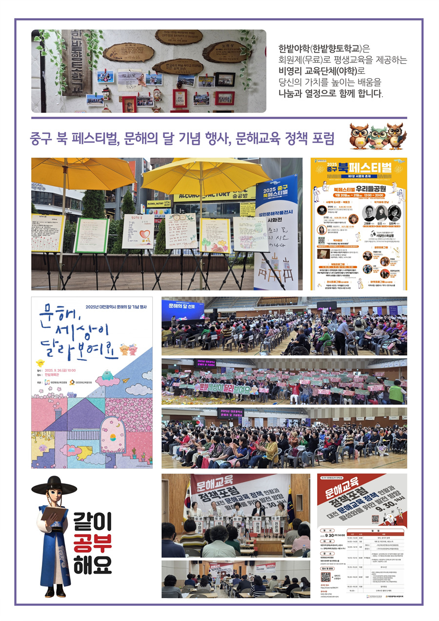 대전야학 한밭향토학교 2025년 9월 소식 _ 성인 문해(한글)교육, 성인 검정고시 교육