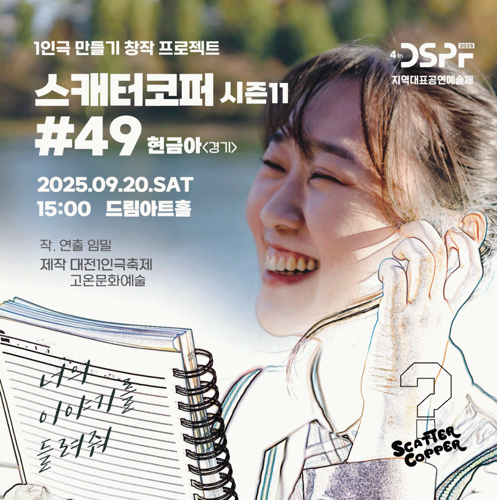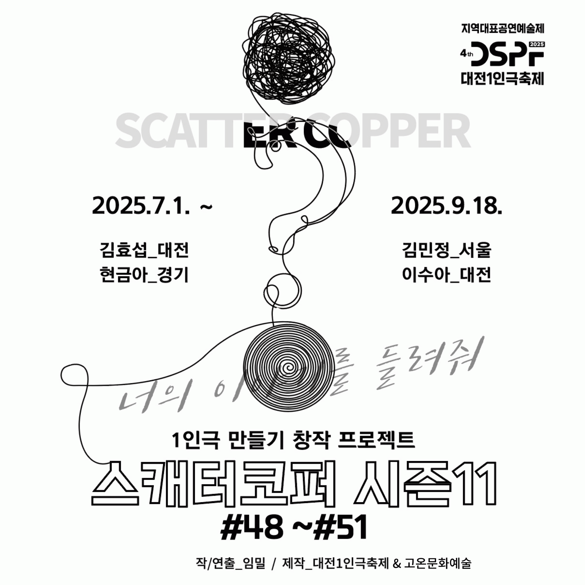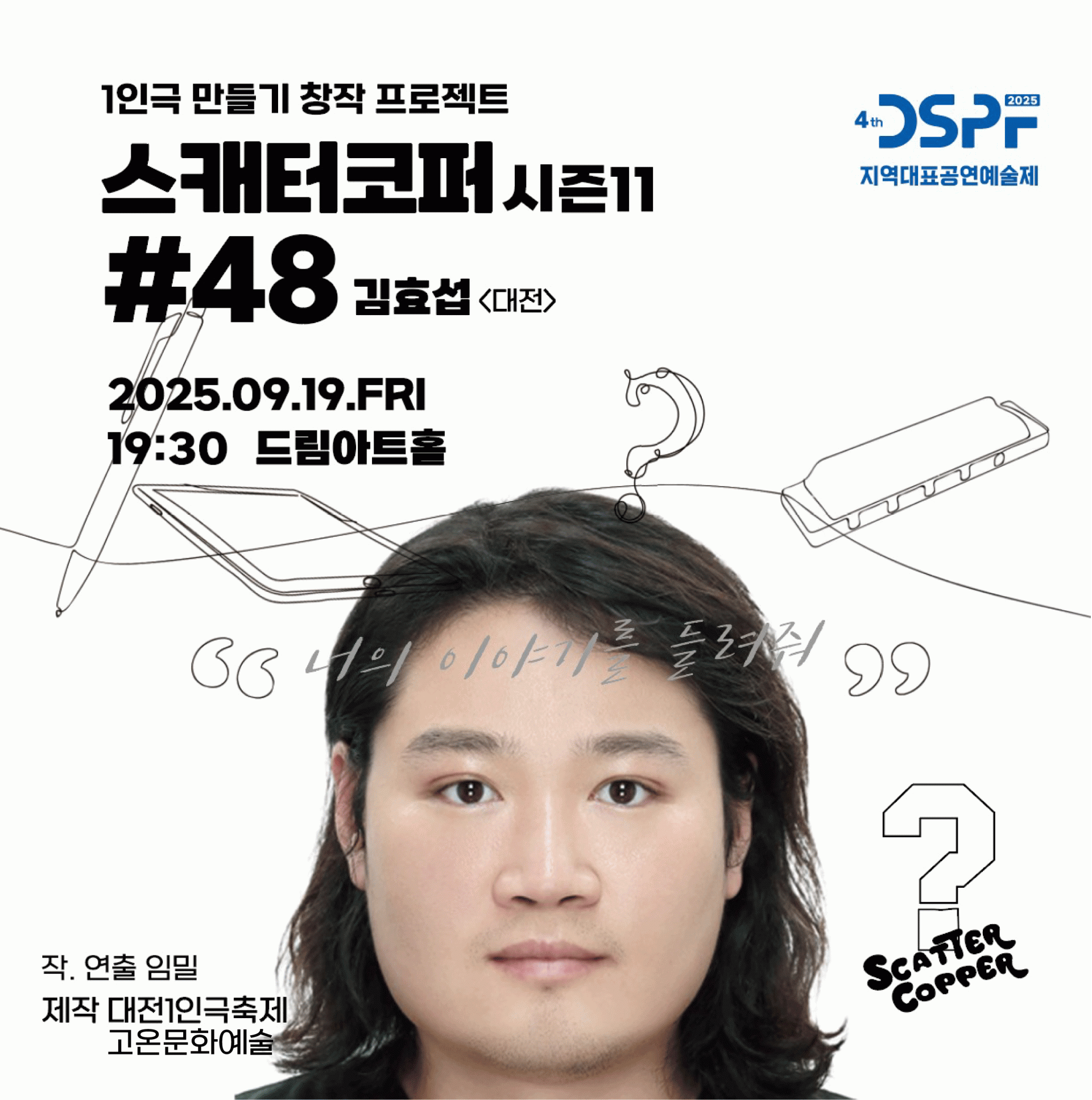 대전1인극축제는 국내 유일하게 1인, 1시간, 극장형 무대 퍼포먼스를 경험할 수 있는 특별한 기회를 제공합니다. 대전 지역을 비롯한 다양한 지역의 1인 아티스트들과 연출가 참여하는 ‘<1인극 만들기 프로젝트-스캐터코퍼 시즌11 #48~#51>’와 한국, 대만, 일본의 협업 작품인 ‘<한만본 프로젝트>’도 선보이며, 차세대 아티스트들의 신선하고 기발한 작품 등 총 10개의 극장 공연과 개,폐막 공연에서도 국내에서 활동하는 다양한 장르의 10명의 예술가들을 만나볼 수 있습니다.