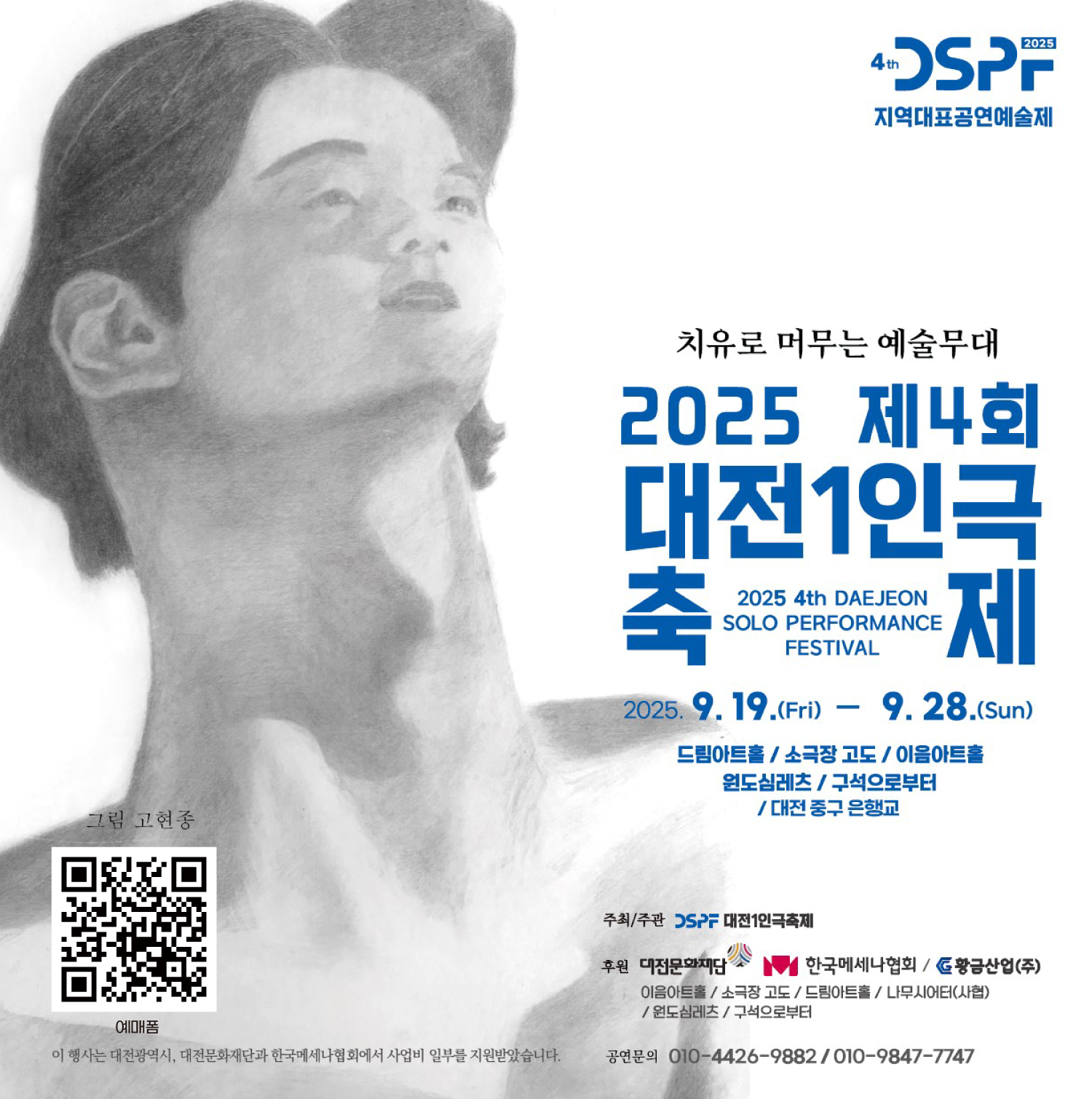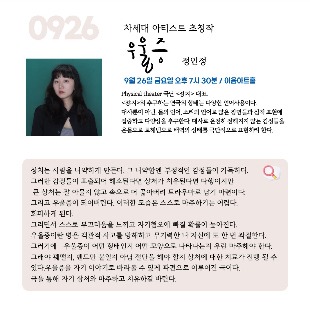 공연은 드림아트홀, 소극장 고도, 이음아트홀 등 여러 극장에서 진행되며, 개막공연은 대전 중구 은행교에서, 폐막공연과 다양한 행사들은 원도심레츠와 구석으로부터에서 펼쳐집니다. 이번 축제는 관객들이 일상 속에서 잠시 벗어나 예술과 치유의 시간을 경험하며, 새로운 영감과 평온을 찾는 소중한 기회가 될 것입니다.