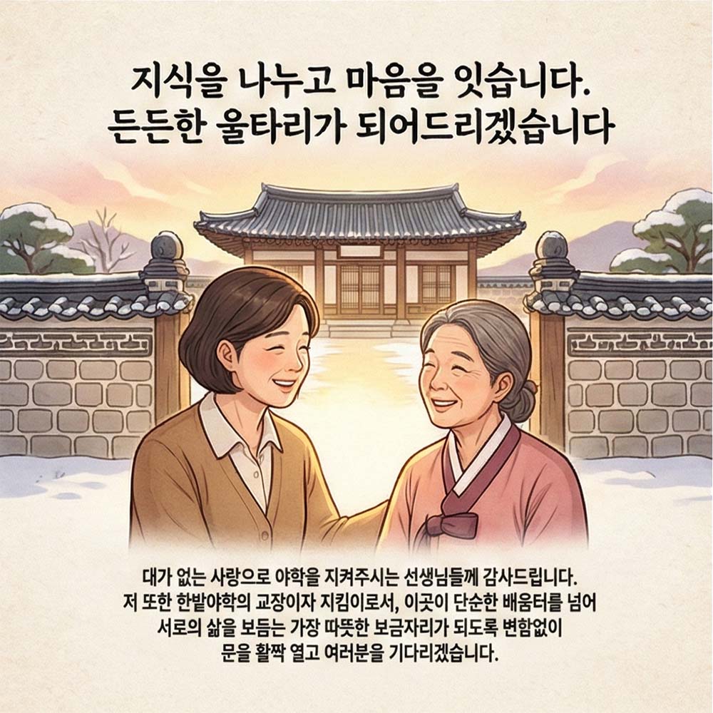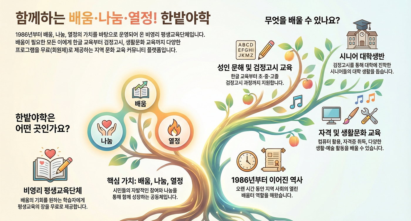 이곳은 성인 학습자를 위한 기초 문해(한글) 교육과 검정고시 과정 뿐만 아니라, AI 및 컴퓨터(디지털) 활용, 시니어 연극교실, 시니어 영어회화, 한국사능력검정, 시니어 대학생 지원 등 현대 사회 적응에 필요한 전문 및 자격 교육을 체계적으로 운영합니다.