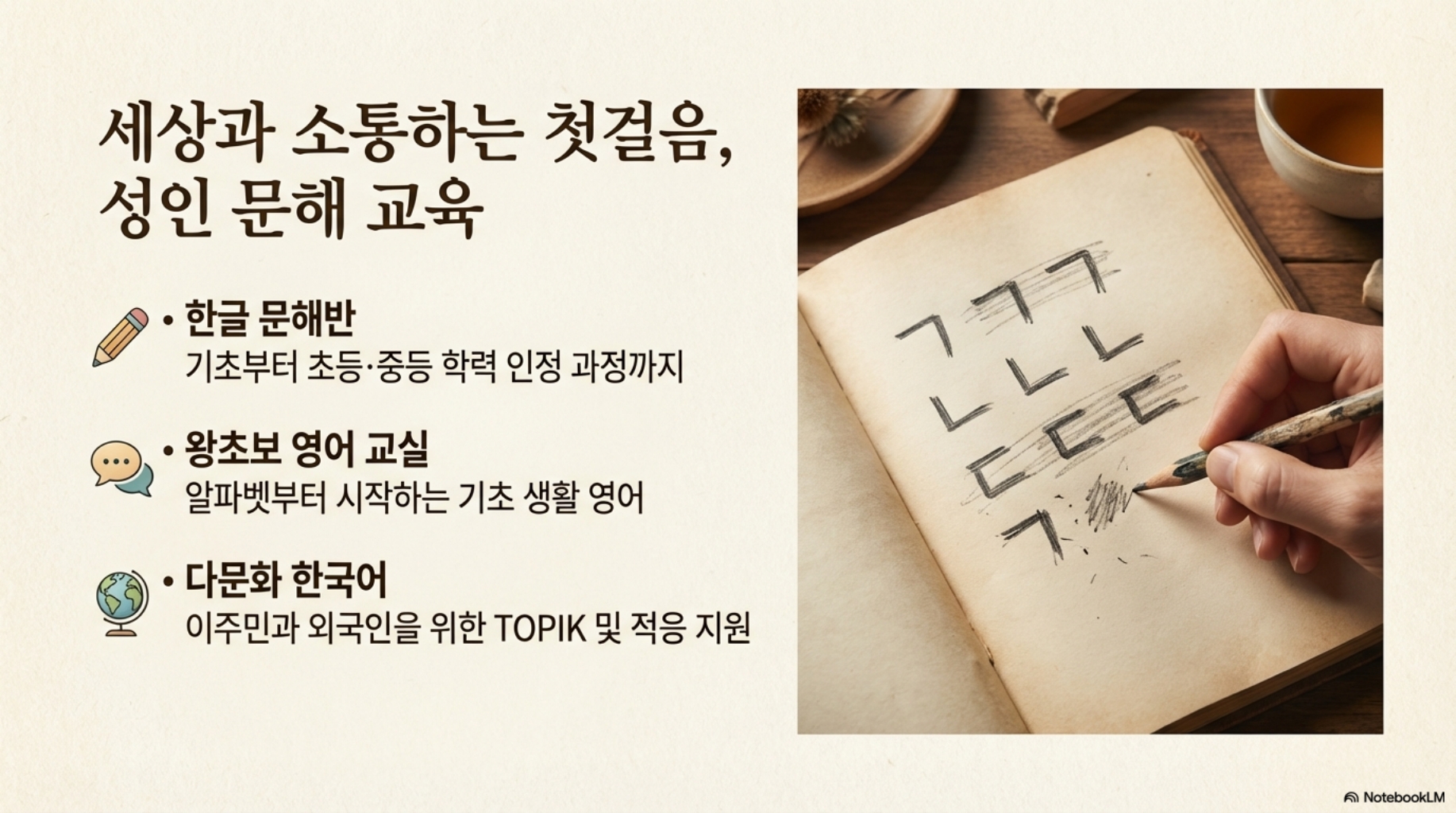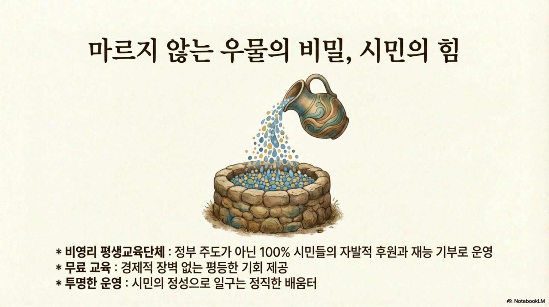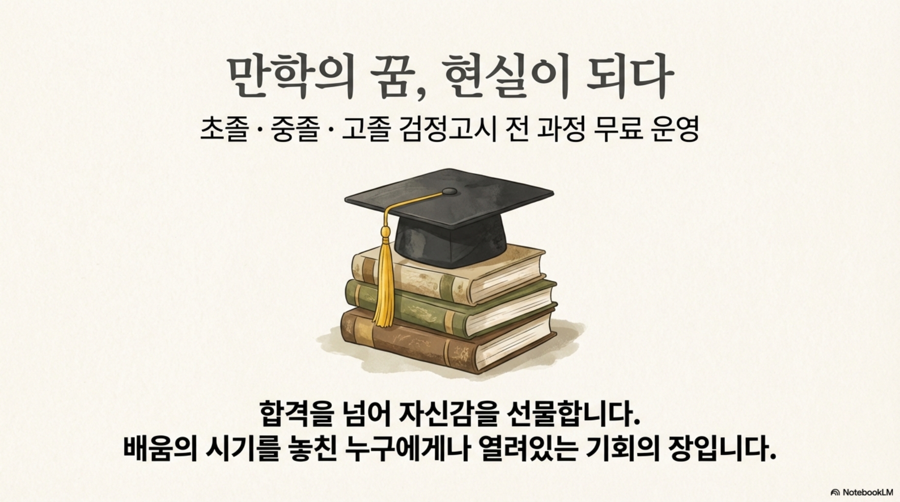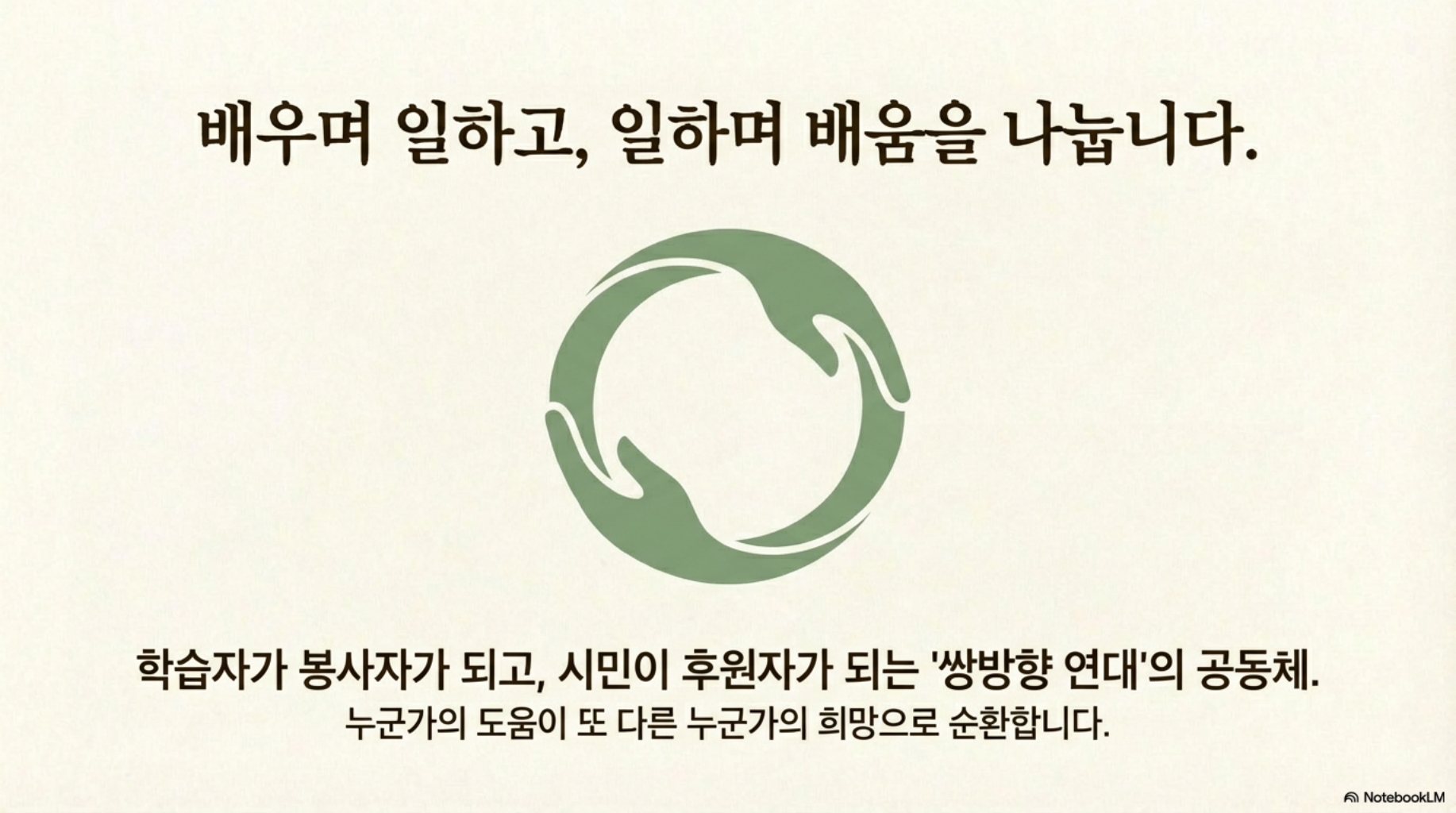 다양한 온라인 채널과 자원봉사 네트워크를 활용해 교육 격차 해소에 앞장서고 있으며, 나눔과 열정의 가치를 바탕으로 학습자의 사회적 자립과 시민 의식 고취를 목표로 합니다.